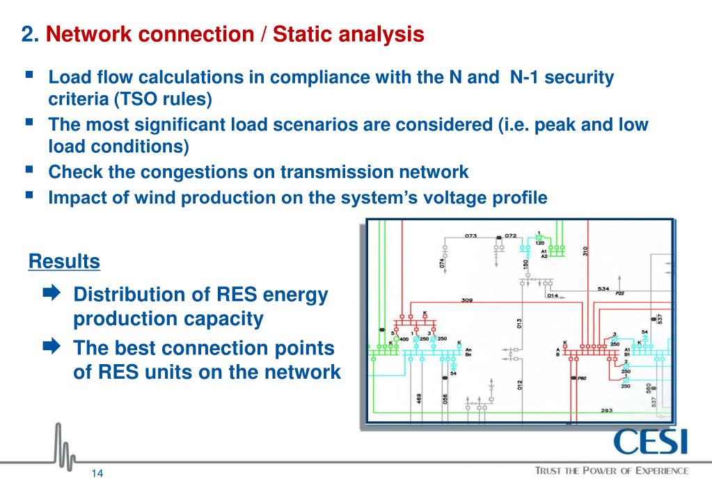 2. Network connection / Static analysis • Load flow calculations in compliance with the N and N-1 security criteria (TSO rules) • The most significant load scenarios are considered (i.e. peak and low load conditions) • Check the congestions on transmission network • Impact of wind production on the system’s voltage profile • Results • Distribution of RES energy production capacity • The best connection pointsof RES units on the network