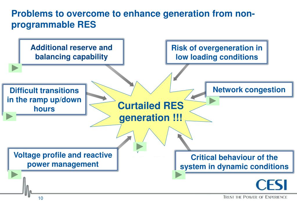 Problems to overcome to enhance generation from non-programmable RES Risk of overgeneration in low loading conditions Network congestion Difficult transitions in the ramp up/down hours Curtailed RES generation !!! Voltage profile and reactive power management Critical behaviour of the system in dynamic conditions Additional reserve and balancing capability
