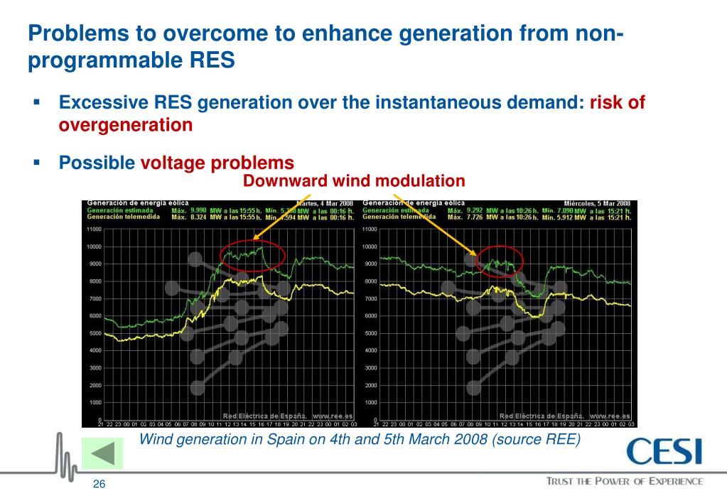 Problems to overcome to enhance generation from non-programmable RES • Excessive RES generation over the instantaneous demand: risk of overgeneration • Possible voltage problems Downwardwindmodulation Wind generation in Spain on 4th and 5th March 2008 (source REE)