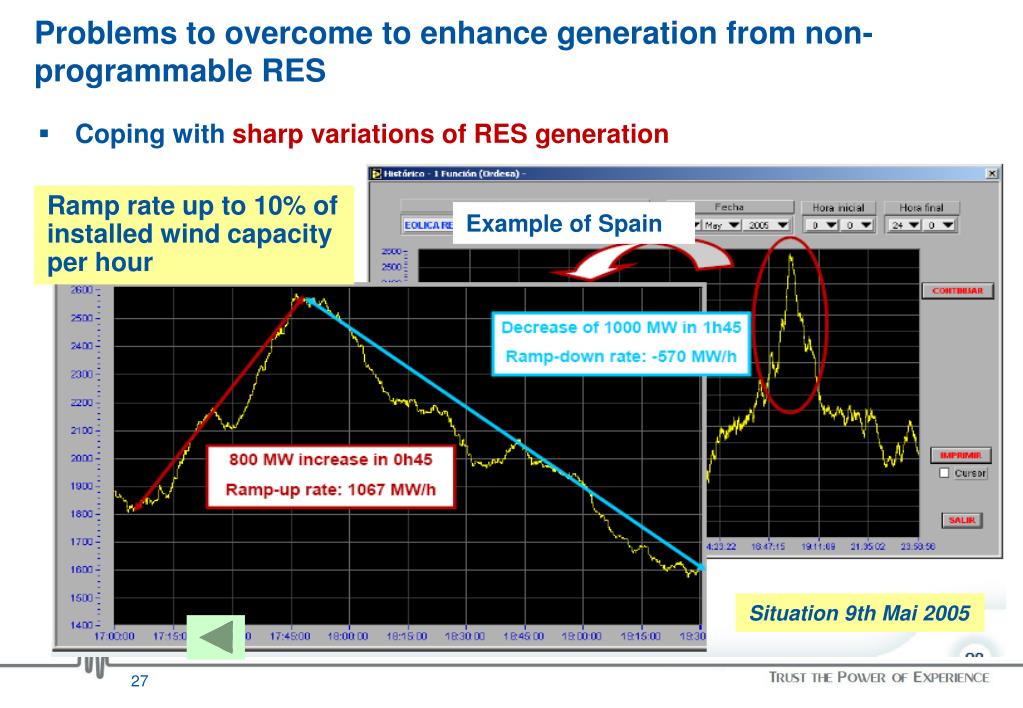 Problems to overcome to enhance generation from non-programmable RES Ramp rate up to 10% of installedwindcapacity per hour Example of Spain Situation 9thMai 2005 Coping with sharp variations of RES generation