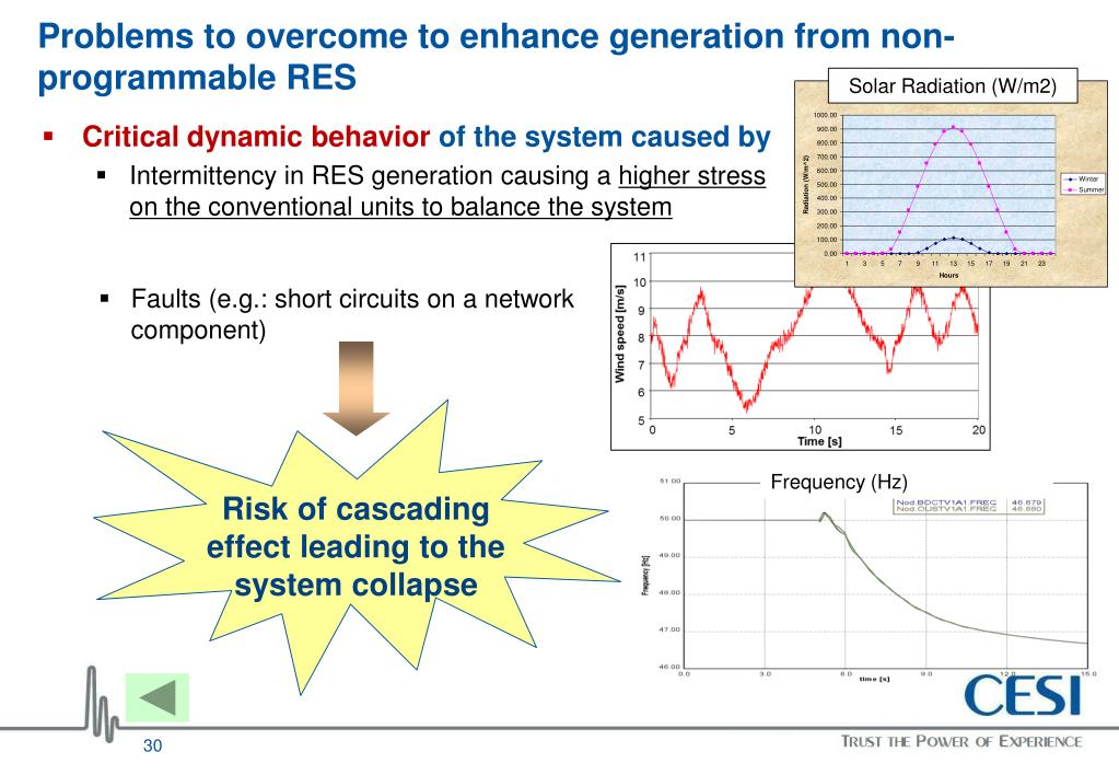 Problems to overcome to enhance generation from non-programmable RES Solar Radiation (W/m2) • Faults (e.g.: short circuits on a network component) Frequency (Hz) Risk of cascading effect leading to the system collapse • Critical dynamic behaviorof the system caused by • Intermittency in RES generation causing a higher stress on the conventional units to balance the system