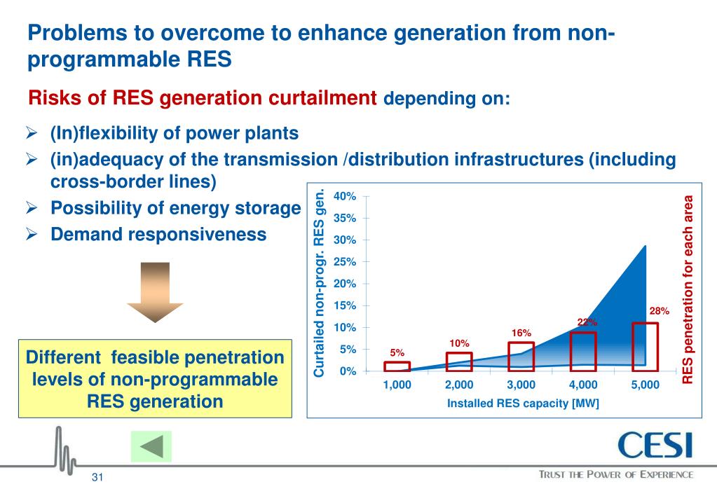 Problems to overcome to enhance generation from non-programmable RES Risks of RES generation curtailment depending on: Different feasible penetration levels of non-programmable RES generation • (In)flexibility of power plants • (in)adequacy of the transmission /distribution infrastructures (including cross-border lines) • Possibility of energy storage • Demand responsiveness