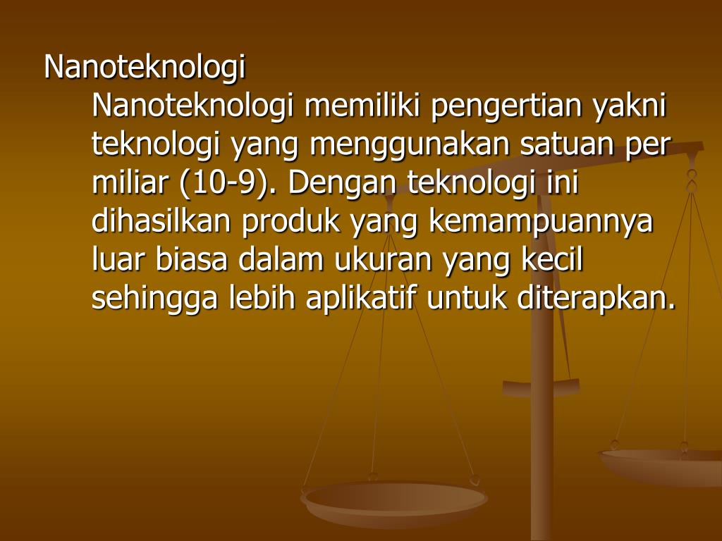 NanoteknologiNanoteknologi memiliki pengertian yakni teknologi yang menggunakan satuan per miliar (10-9). Dengan teknologi ini dihasilkan produk yang kemampuannya luar biasa dalam ukuran yang kecil sehingga lebih aplikatif untuk diterapkan.