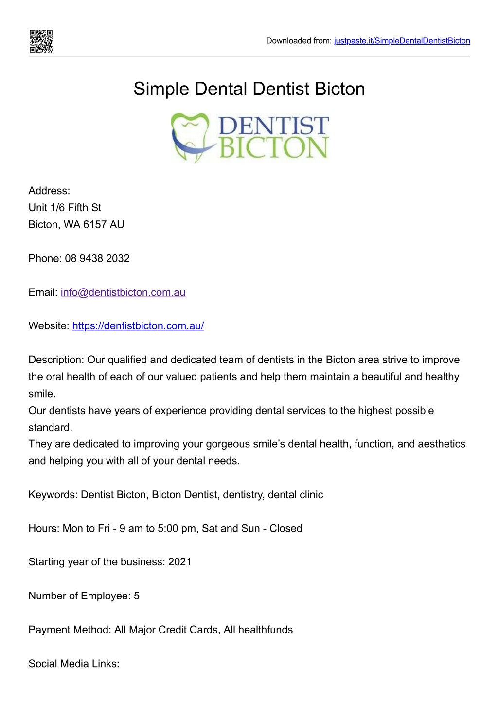 Downloaded from: justpaste.it/SimpleDentalDentistBicton Simple Dental Dentist Bicton Address: Unit 1/6 Fifth St Bicton, WA 6157 AU Phone: 08 9438 2032 Email: info@dentistbicton.com.au Website: https://dentistbicton.com.au/ Description: Our qualified and dedicated team of dentists in the Bicton area strive to improve the oral health of each of our valued patients and help them maintain a beautiful and healthy smile. Our dentists have years of experience providing dental services to the highest possible standard. They are dedicated to improving your gorgeous smile’s dental health, function, and aesthetics and helping you with all of your dental needs. Keywords: Dentist Bicton, Bicton Dentist, dentistry, dental clinic Hours: Mon to Fri - 9 am to 5:00 pm, Sat and Sun - Closed Starting year of the business: 2021 Number of Employee: 5 Payment Method: All Major Credit Cards, All healthfunds Social Media Links: