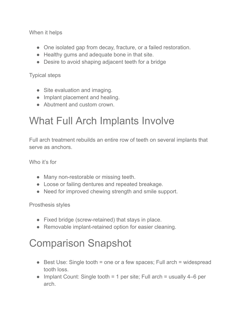 When it helps ● One isolated gap from decay, fracture, or a failed restoration. ● Healthy gums and adequate bone in that site. ● Desire to avoid shaping adjacent teeth for a bridge Typical steps ● Site evaluation and imaging. ● Implant placement and healing. ● Abutment and custom crown. What Full Arch Implants Involve Full arch treatment rebuilds an entire row of teeth on several implants that serve as anchors. Who it’s for ● Many non-restorable or missing teeth. ● Loose or failing dentures and repeated breakage. ● Need for improved chewing strength and smile support. Prosthesis styles ● Fixed bridge (screw-retained) that stays in place. ● Removable implant-retained option for easier cleaning. Comparison Snapshot ● Best Use: Single tooth = one or a few spaces; Full arch = widespread tooth loss. ● Implant Count: Single tooth = 1 per site; Full arch = usually 4–6 per arch.