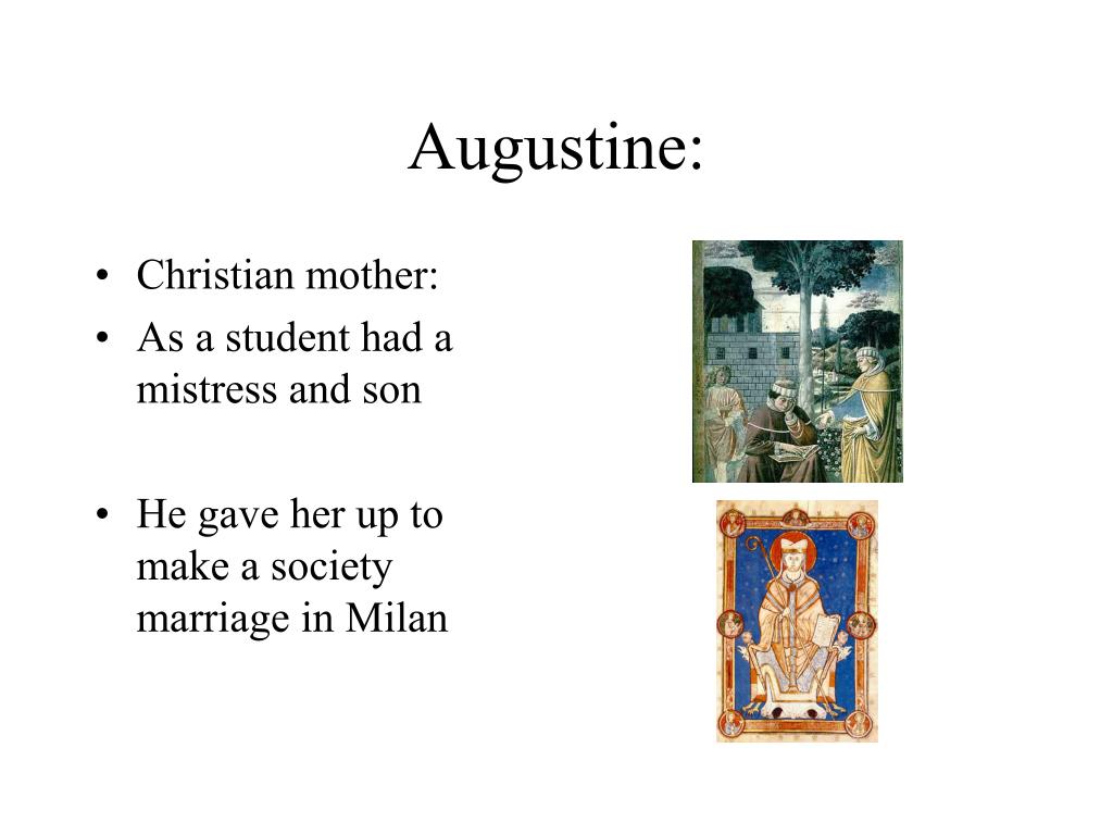 Augustine: • Christian mother: • As a student had a mistress and son • He gave her up to make a society marriage in Milan