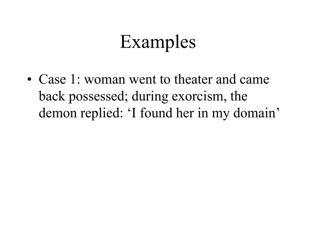 Examples • Case 1: woman went to theater and came back possessed; during exorcism, the demon replied: ‘I found her in my domain’