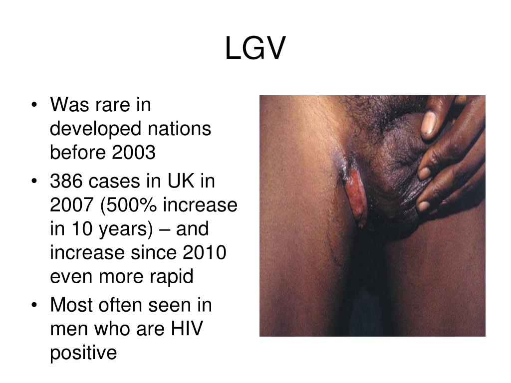 LGV • Was rare in developed nations before 2003 • 386 cases in UK in 2007 (500% increase in 10 years) – and increase since 2010 even more rapid • Most often seen in men who are HIV positive
