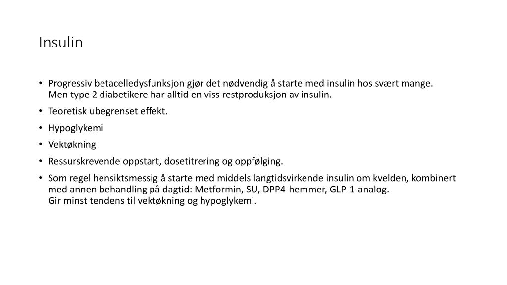 Insulin • Progressiv betacelledysfunksjon gjør det nødvendig å starte med insulin hos svært mange.Men type 2 diabetikere har alltid en viss restproduksjon av insulin. • Teoretisk ubegrenset effekt. • Hypoglykemi • Vektøkning • Ressurskrevende oppstart, dosetitrering og oppfølging. • Som regel hensiktsmessig å starte med middels langtidsvirkende insulin om kvelden, kombinert med annen behandling på dagtid: Metformin, SU, DPP4-hemmer, GLP-1-analog.Gir minst tendens til vektøkning og hypoglykemi.