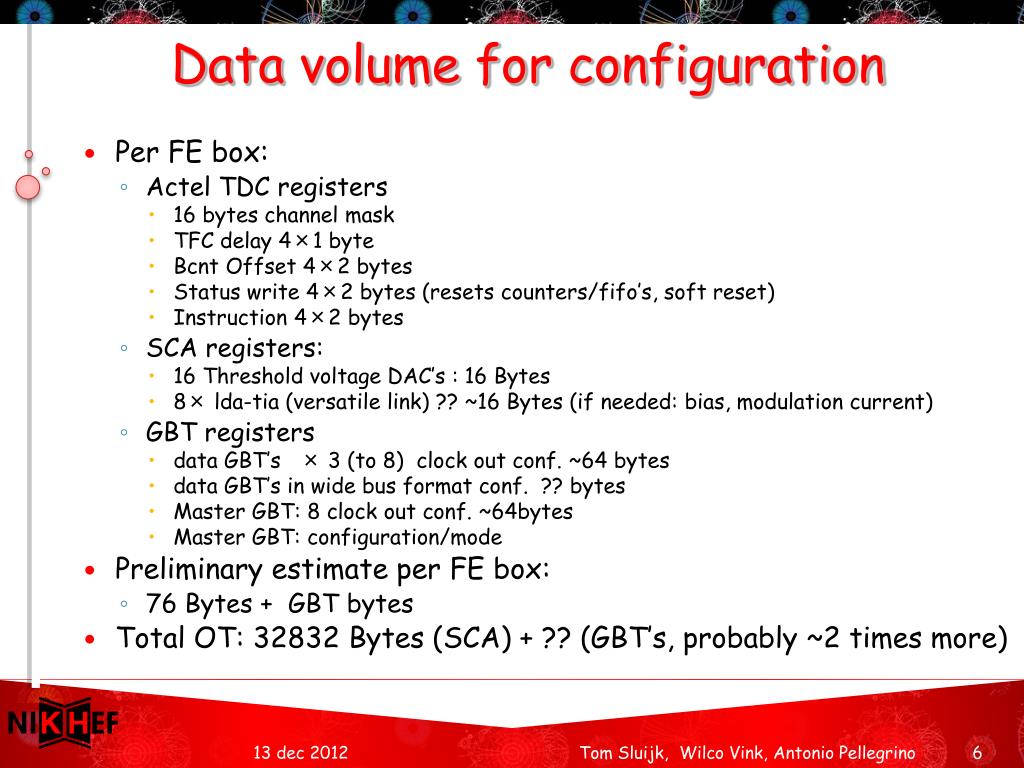 Data volume for configuration • Per FE box: • Actel TDC registers • 16 bytes channel mask • TFC delay 4×1 byte • Bcnt Offset 4×2 bytes • Status write 4×2 bytes (resets counters/fifo’s, soft reset) • Instruction 4×2 bytes • SCA registers: • 16 Threshold voltage DAC’s : 16 Bytes • 8× lda-tia (versatile link) ?? ~16 Bytes (if needed: bias, modulation current) • GBT registers • data GBT’s × 3 (to 8) clock out conf. ~64 bytes • data GBT’s in wide bus format conf. ?? bytes • Master GBT: 8 clock out conf. ~64bytes • Master GBT: configuration/mode • Preliminary estimate per FE box: • 76 Bytes + GBT bytes • Total OT: 32832 Bytes (SCA) + ?? (GBT’s, probably ~2 times more) Tom Sluijk, Wilco Vink, Antonio Pellegrino
