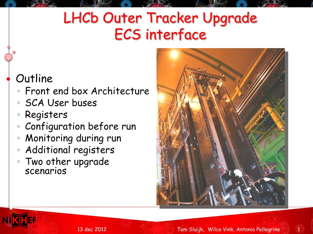LHCb Outer Tracker UpgradeECS interface • Outline • Front end box Architecture • SCA User buses • Registers • Configuration before run • Monitoring during run • Additional registers • Two other upgrade scenarios Tom Sluijk, Wilco Vink, Antonio Pellegrino