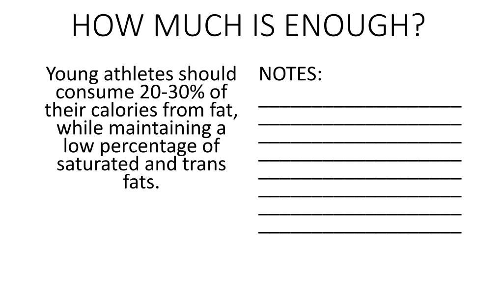 HOW MUCH IS ENOUGH? Young athletes should consume 20-30% of their calories from fat, while maintaining a low percentage of saturated and trans fats. NOTES: ________________________________________________________________________________________________________________________________________________________