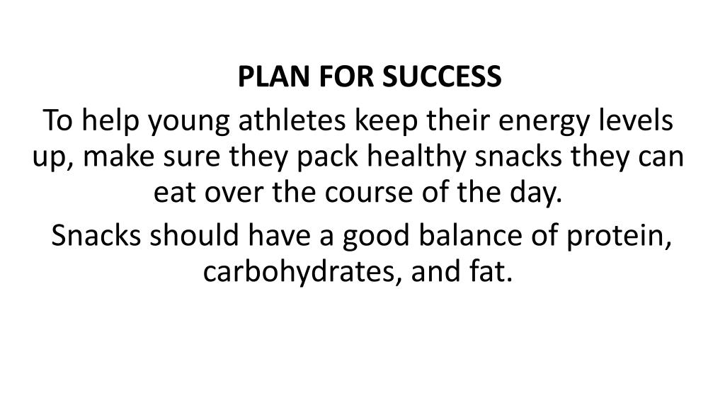 PLAN FOR SUCCESS To help young athletes keep their energy levels up, make sure they pack healthy snacks they can eat over the course of the day. Snacks should have a good balance of protein, carbohydrates, and fat.