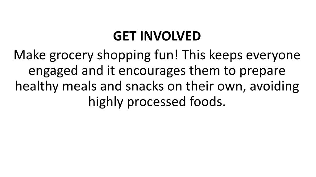GET INVOLVED Make grocery shopping fun! This keeps everyone engaged and it encourages them to prepare healthy meals and snacks on their own, avoiding highly processed foods.