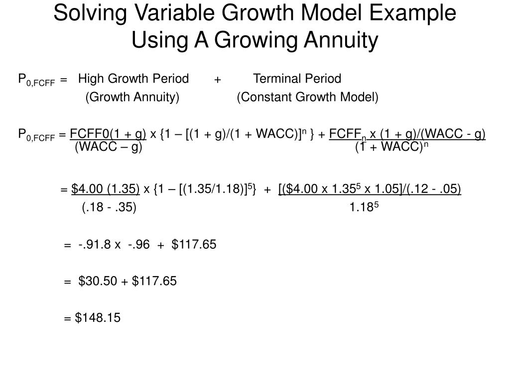 Solving Variable Growth Model Example Using A Growing Annuity P0,FCFF = High Growth Period + Terminal Period (Growth Annuity) (Constant Growth Model) P0,FCFF = FCFF0(1 + g) x {1 – [(1 + g)/(1 + WACC)]n } + FCFFn x (1 + g)/(WACC - g) (WACC – g) (1 + WACC)n = $4.00 (1.35) x {1 – [(1.35/1.18)]5} + [($4.00 x 1.355 x 1.05]/(.12 - .05) (.18 - .35) 1.185 = -.91.8 x -.96 + $117.65 = $30.50 + $117.65 = $148.15