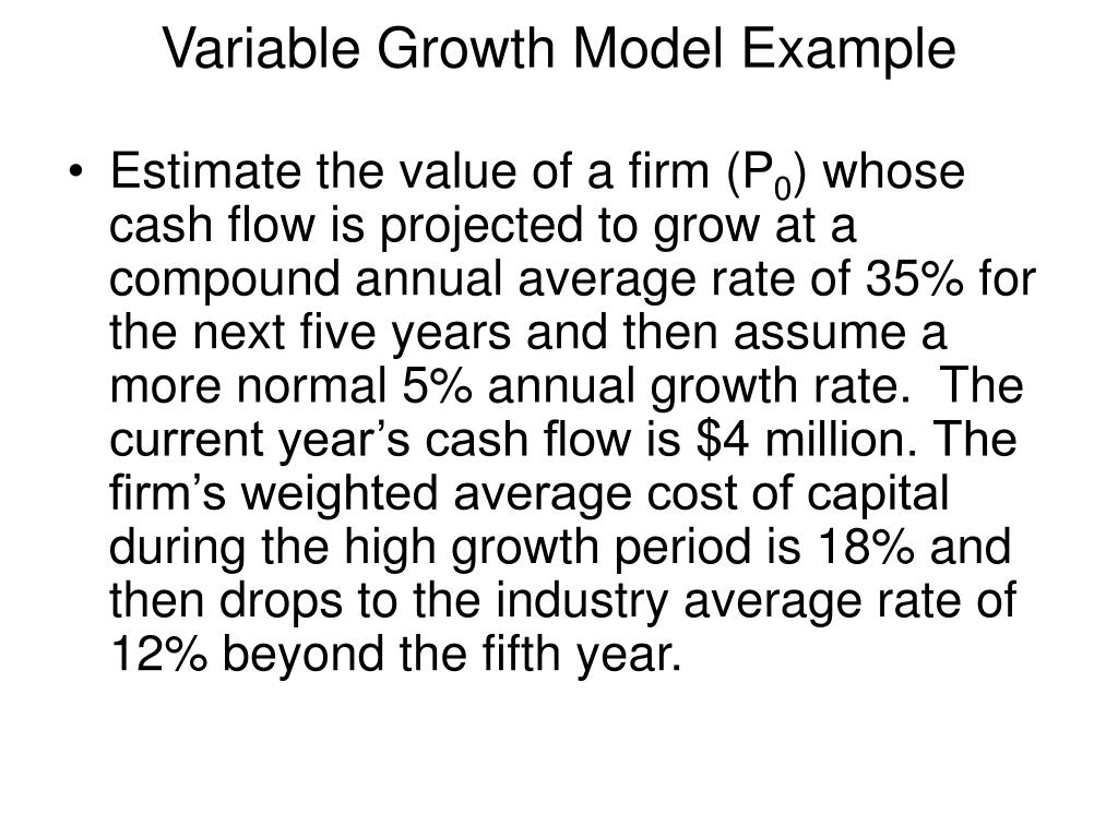 Variable Growth Model Example • Estimate the value of a firm (P0) whose cash flow is projected to grow at a compound annual average rate of 35% for the next five years and then assume a more normal 5% annual growth rate. The current year’s cash flow is $4 million. The firm’s weighted average cost of capital during the high growth period is 18% and then drops to the industry average rate of 12% beyond the fifth year.