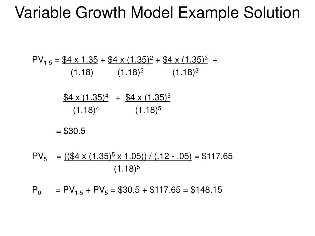 Variable Growth Model Example Solution PV1-5 = $4 x 1.35 + $4 x (1.35)2 + $4 x (1.35)3 + (1.18) (1.18)2 (1.18)3 $4 x (1.35)4 + $4 x (1.35)5 (1.18)4 (1.18)5 = $30.5 PV5 = (($4 x (1.35)5 x 1.05)) / (.12 - .05) = $117.65 (1.18)5 P0 = PV1-5 + PV5 = $30.5 + $117.65 = $148.15