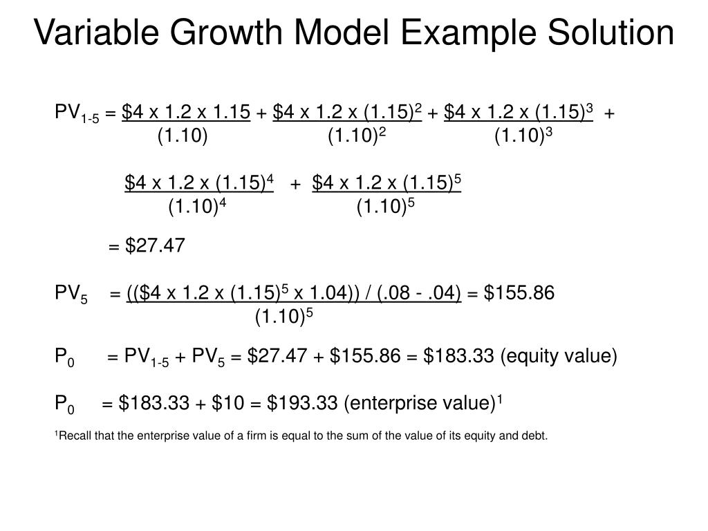 Variable Growth Model Example Solution PV1-5 = $4 x 1.2 x 1.15 + $4 x 1.2 x (1.15)2 + $4 x 1.2 x (1.15)3 + (1.10) (1.10)2 (1.10)3 $4 x 1.2 x (1.15)4 + $4 x 1.2 x (1.15)5 (1.10)4 (1.10)5 = $27.47 PV5 = (($4 x 1.2 x (1.15)5 x 1.04)) / (.08 - .04) = $155.86 (1.10)5 P0 = PV1-5 + PV5 = $27.47 + $155.86 = $183.33 (equity value) P0 = $183.33 + $10 = $193.33 (enterprise value)1 1Recall that the enterprise value of a firm is equal to the sum of the value of its equity and debt.