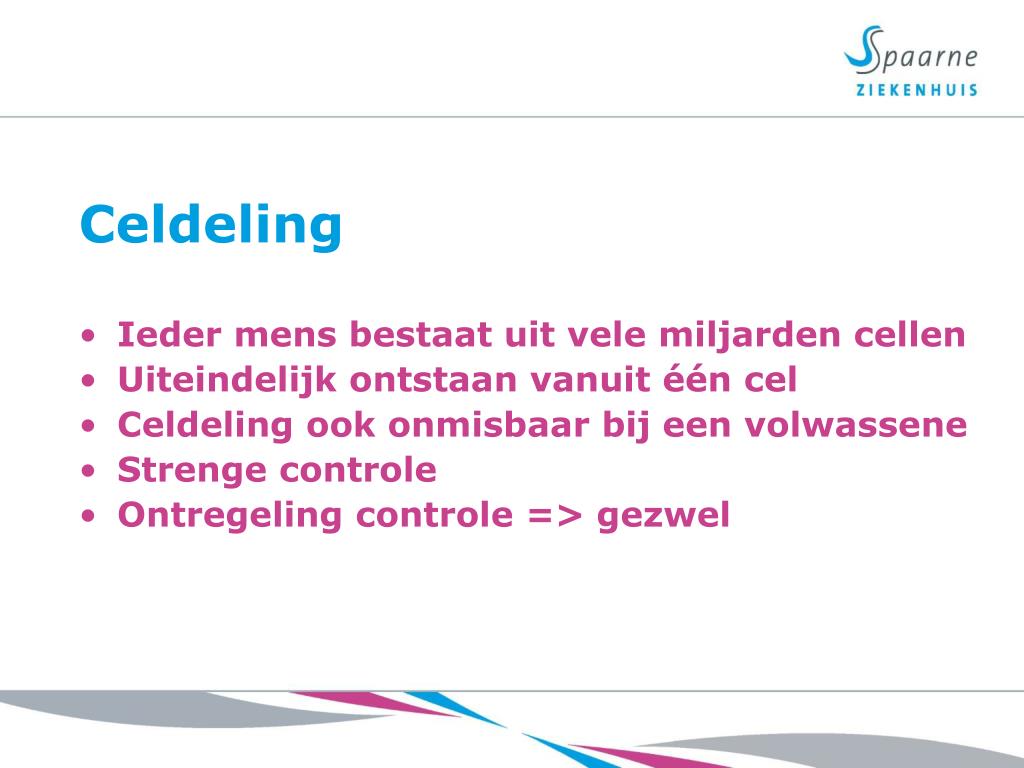 Celdeling • Ieder mens bestaat uit vele miljarden cellen • Uiteindelijk ontstaan vanuit één cel • Celdeling ook onmisbaar bij een volwassene • Strenge controle • Ontregeling controle => gezwel