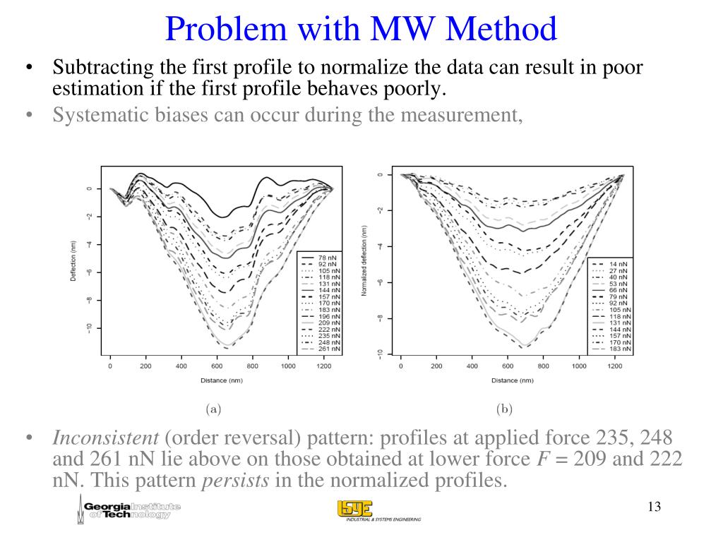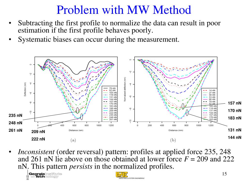 Problem with MW Method • Subtracting the first profile to normalize the data can result in poor estimation if the first profile behaves poorly. • Systematic biases can occur during the measurement, • Inconsistent (order reversal) pattern: profiles at applied force 235, 248 and 261 nN lie above on those obtained at lower force F = 209 and 222 nN. This pattern persists in the normalized profiles.