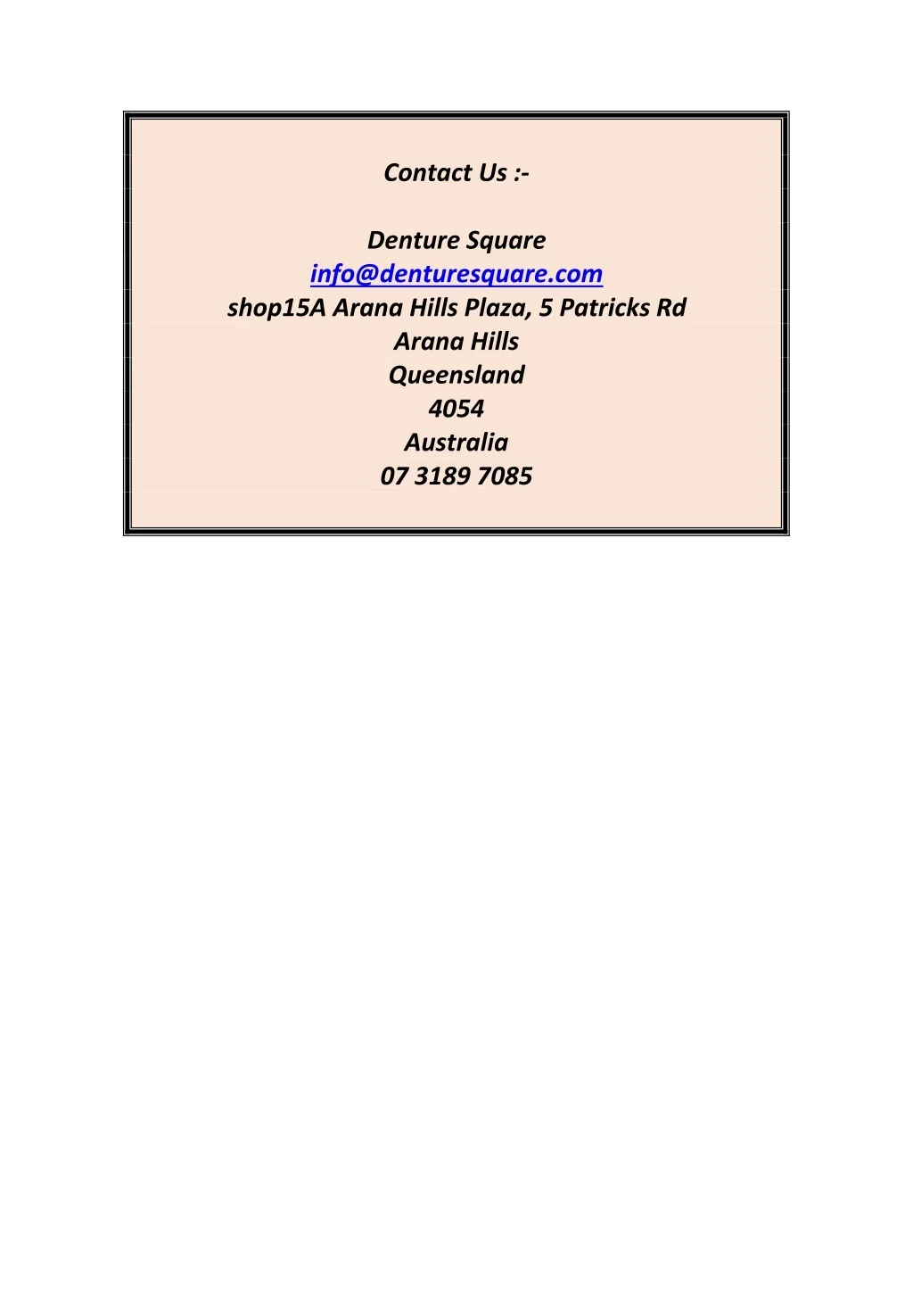 Contact Us :- Denture Square info@denturesquare.com shop15A Arana Hills Plaza, 5 Patricks Rd Arana Hills Queensland 4054 Australia 07 3189 7085