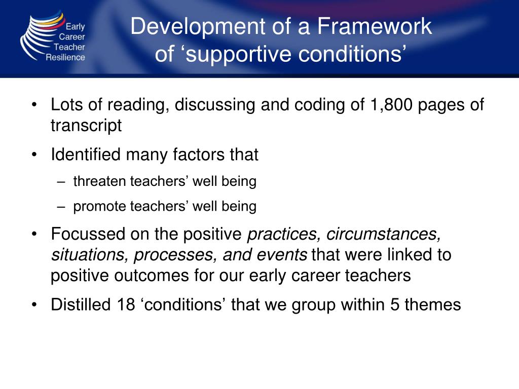 Development of a Framework of ‘supportive conditions’ • Lots of reading, discussing and coding of 1,800 pages of transcript • Identified many factors that • threaten teachers’ well being • promote teachers’ well being • Focussed on the positive practices, circumstances, situations, processes, and eventsthat were linked to positive outcomes for our early career teachers • Distilled 18 ‘conditions’ that we group within 5 themes