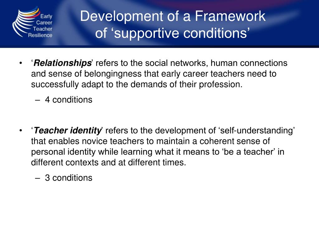 Development of a Framework of ‘supportive conditions’ • ‘Relationships’ refers to the social networks, human connections and sense of belongingness that early career teachers need to successfully adapt to the demands of their profession. • 4 conditions • ‘Teacher identity’ refers to the development of ‘self-understanding’ that enables novice teachers to maintain a coherent sense of personal identity while learning what it means to ‘be a teacher’ in different contexts and at different times. • 3 conditions