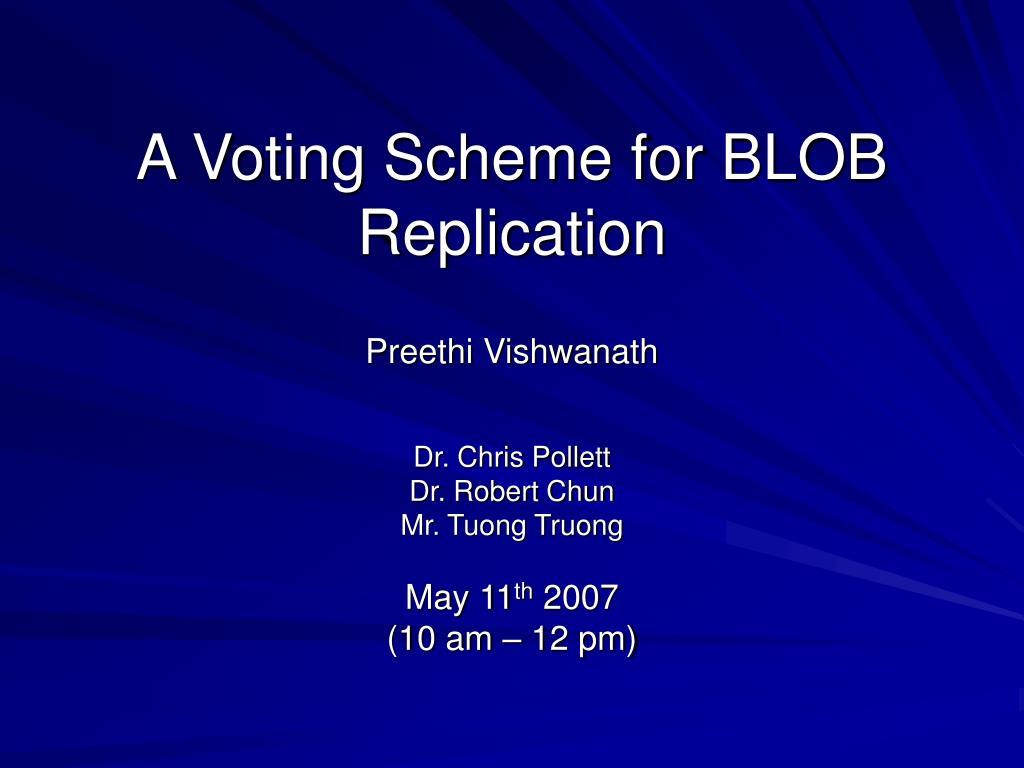 A Voting Scheme for BLOB Replication Preethi Vishwanath Dr. Chris Pollett Dr. Robert Chun Mr. Tuong Truong May 11th 2007 (10 am – 12 pm)