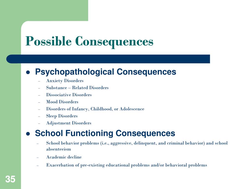 Possible Consequences • Psychopathological Consequences • Anxiety Disorders • Substance – Related Disorders • Dissociative Disorders • Mood Disorders • Disorders of Infancy, Childhood, or Adolescence • Sleep Disorders • Adjustment Disorders • School Functioning Consequences • School behavior problems (i.e., aggressive, delinquent, and criminal behavior) and school absenteeism • Academic decline • Exacerbation of pre-existing educational problems and/or behavioral problems 35