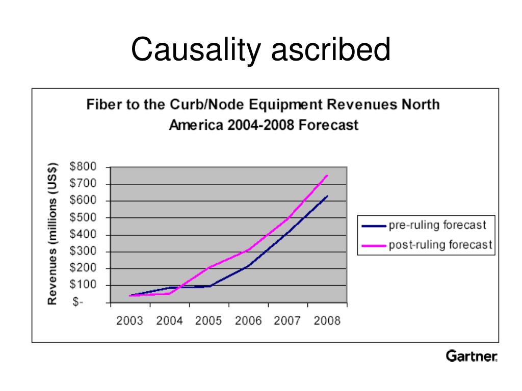 Causality asserted by the FCC • “[W]e don't have a duopoly in broadband. We don't even have a monopoly in broadband. We have a ‘no-opoly.’ • “So how do we get Americans broadband pipes? .. [B]y letting a competitive marketplace thrive.” • FCC Chairman William E. Kennard (No. Calif. FCBA, San Francisco, CA, July 20, 1999) • and rejecting “open access” rules