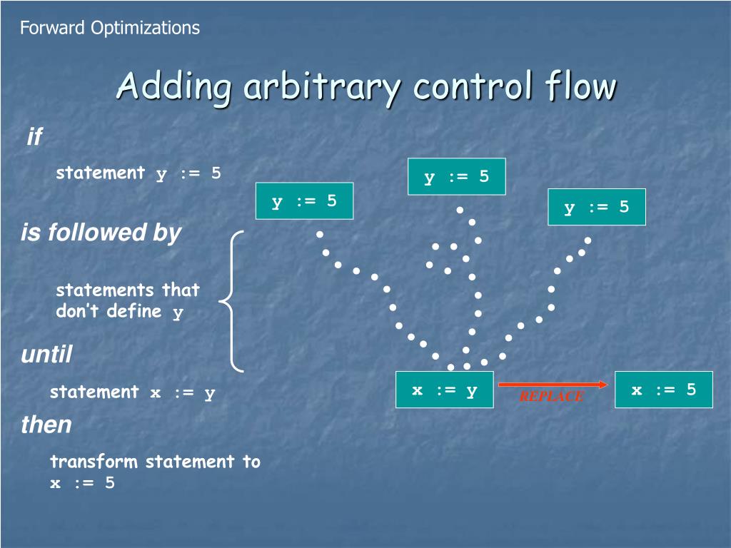 REPLACE Forward Optimizations Adding arbitrary control flow if statement y := 5 y := 5 y := 5 y := 5 is followed by statements that don’t define y until x := y x := 5 statement x := y then transform statement to x := 5