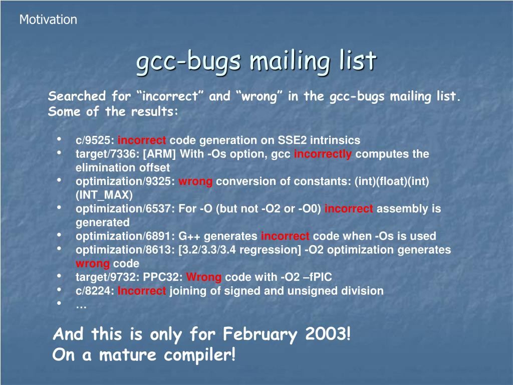 Motivation gcc-bugs mailing list Searched for “incorrect” and “wrong” in the gcc-bugs mailing list. Some of the results: • c/9525: incorrect code generation on SSE2 intrinsics • target/7336: [ARM] With -Os option, gcc incorrectly computes the elimination offset • optimization/9325: wrong conversion of constants: (int)(float)(int) (INT_MAX) • optimization/6537: For -O (but not -O2 or -O0) incorrect assembly is generated • optimization/6891: G++ generates incorrect code when -Os is used • optimization/8613: [3.2/3.3/3.4 regression] -O2 optimization generates wrong code • target/9732: PPC32: Wrong code with -O2 –fPIC • c/8224: Incorrect joining of signed and unsigned division • … And this is only for February 2003! On a mature compiler!