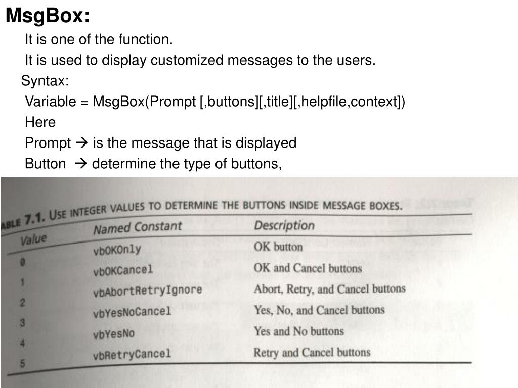MsgBox: It is one of the function. It is used to display customized messages to the users. Syntax: Variable = MsgBox(Prompt [,buttons][,title][,helpfile,context]) Here Prompt is the message that is displayed Button determine the type of buttons,