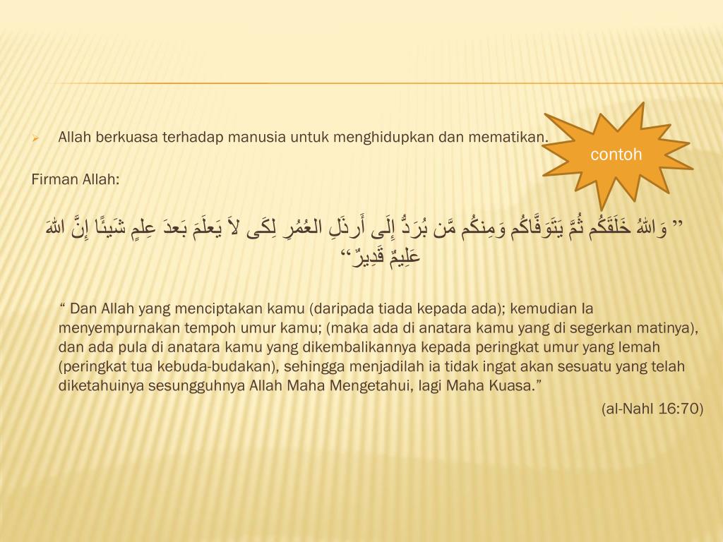 Allah berkuasa terhadap manusia untuk menghidupkan dan mematikan. Firman Allah: ” وَاللهُ خَلَقَكُم ثُمَّ يَتَوَفَّاكُم وَمِنكُم مَّن بُرَدُّ إِلَى أَرذَلِ العُمُرِ لِكَى لاَ يَعلَمَ بَعدَ عِلمٍ شَيئًا إِنَّ اللهَ عَلِيمٌ قَدِيرٌ“ “ Dan Allah yang menciptakan kamu (daripada tiada kepada ada); kemudian Ia menyempurnakan tempoh umur kamu; (maka ada di anatara kamu yang di segerkan matinya), dan ada pula di anatara kamu yang dikembalikannya kepada peringkat umur yang lemah (peringkat tua kebuda-budakan), sehingga menjadilah ia tidak ingat akan sesuatu yang telah diketahuinya sesungguhnya Allah Maha Mengetahui, lagi Maha Kuasa.” (al-Nahl 16:70) contoh
