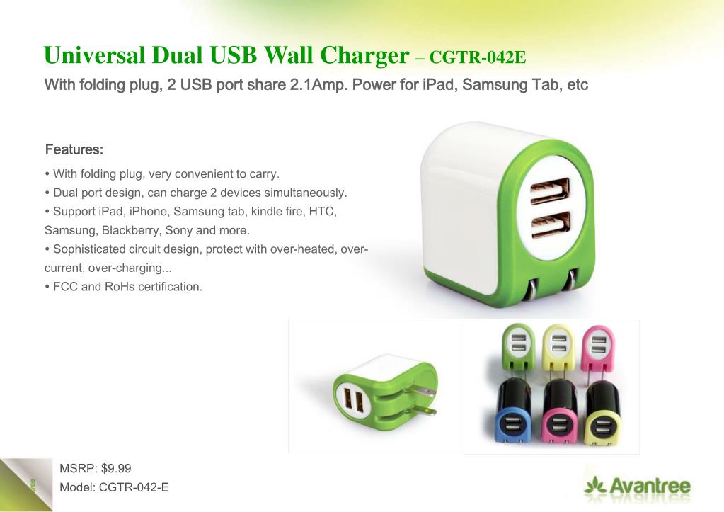 Universal Dual USB Wall Charger – CGTR-042E. With folding plug, 2 USB port share 2.1Amp. Power for iPad, Samsung Tab, etc. Features:. With folding plug, very convenient to carry. Dual port design, can charge 2 devices simultaneously.