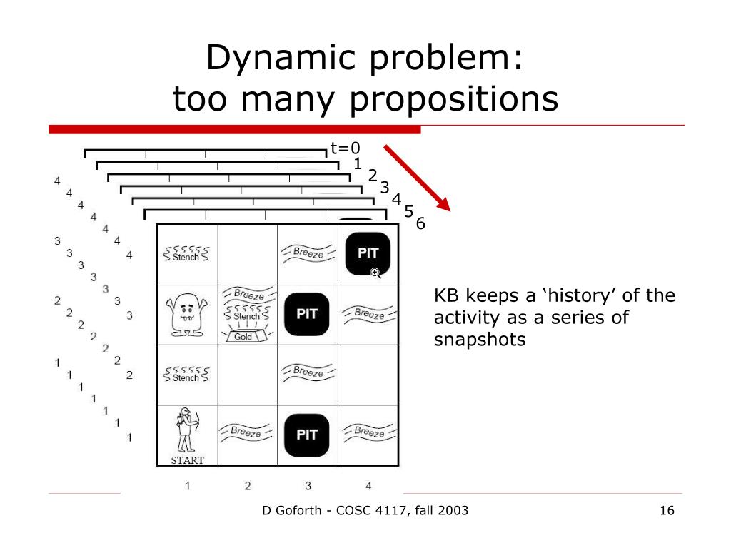 t=0 1 2 3 4 5 6 Dynamic problem:too many propositions KB keeps a ‘history’ of the activity as a series of snapshots D Goforth - COSC 4117, fall 2003