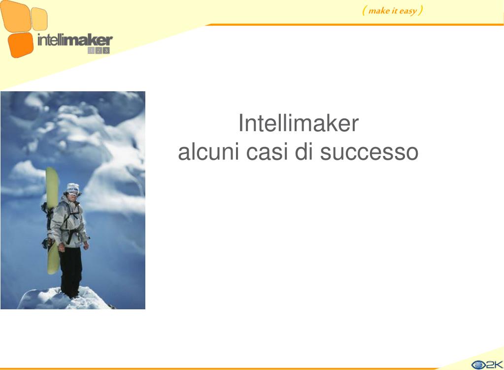 modalità di business… Come si articola l’offerta Intellimaker… - ASP (Application Service Provisioning) - On Site (installata su server del cliente) • Con engine Intellimaker • Senza engine Intellimaker (solo verticale) - Consulenza, analisi, progettazione- Acquisto verticale esistente - Formazione - Assistenza …anche senza scrivere una riga di codice