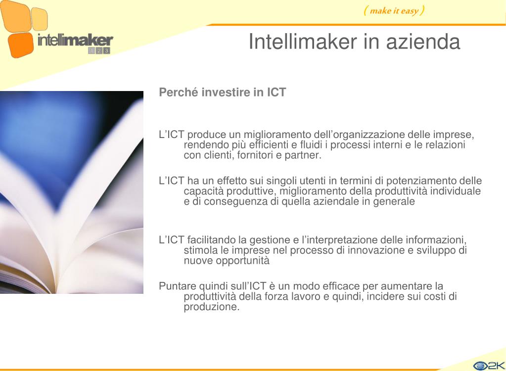Intellimaker in azienda Perché investire in ICT L’ICT produce un miglioramento dell’organizzazione delle imprese, rendendo più efficienti e fluidi i processi interni e le relazioni con clienti, fornitori e partner. L’ICT ha un effetto sui singoli utenti in termini di potenziamento delle capacità produttive, miglioramento della produttività individuale e di conseguenza di quella aziendale in generale L’ICT facilitando la gestione e l’interpretazione delle informazioni, stimola le imprese nel processo di innovazione e sviluppo di nuove opportunità Puntare quindi sull’ICT è un modo efficace per aumentare la produttività della forza lavoro e quindi, incidere sui costi di produzione.