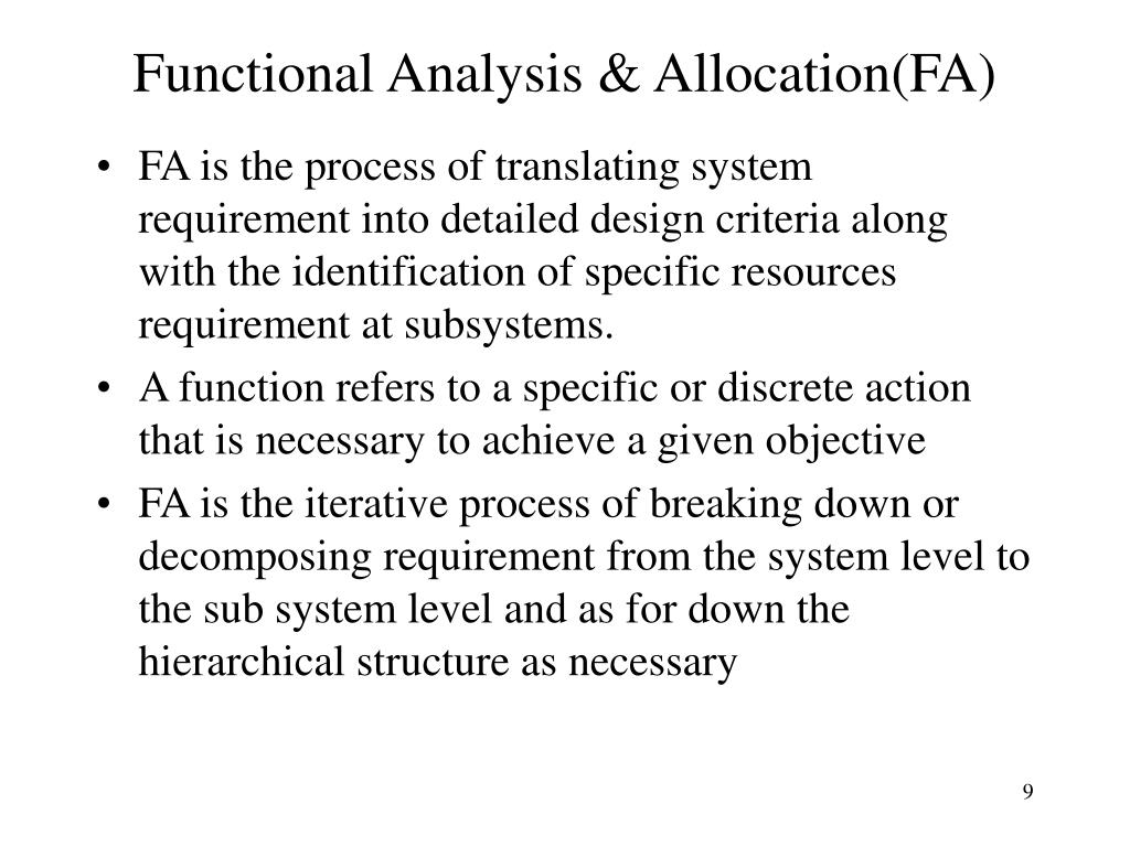 Functional Analysis & Allocation(FA) • FA is the process of translating system requirement into detailed design criteria along with the identification of specific resources requirement at subsystems. • A function refers to a specific or discrete action that is necessary to achieve a given objective • FA is the iterative process of breaking down or decomposing requirement from the system level to the sub system level and as for down the hierarchical structure as necessary