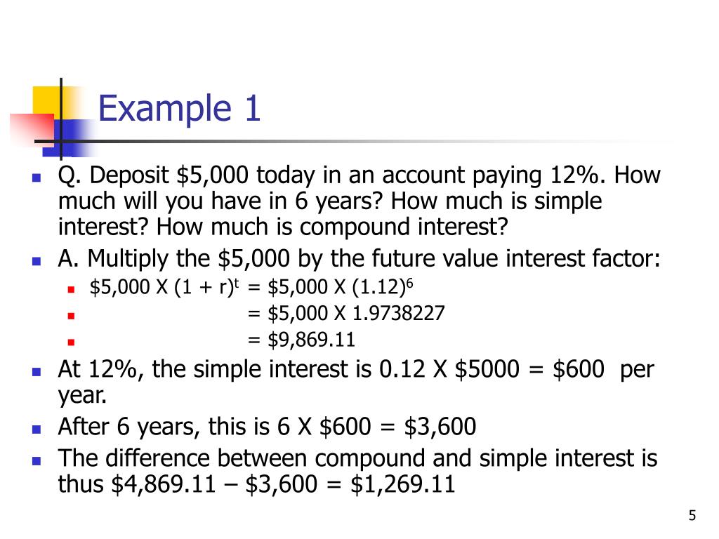 Example 1 • Q. Deposit $5,000 today in an account paying 12%. How much will you have in 6 years? How much is simple interest? How much is compound interest? • A. Multiply the $5,000 by the future value interest factor: • $5,000 X (1 + r)t = $5,000 X (1.12)6 • = $5,000 X 1.9738227 • = $9,869.11 • At 12%, the simple interest is 0.12 X $5000 = $600 per year. • After 6 years, this is 6 X $600 = $3,600 • The difference between compound and simple interest is thus $4,869.11 – $3,600 = $1,269.11