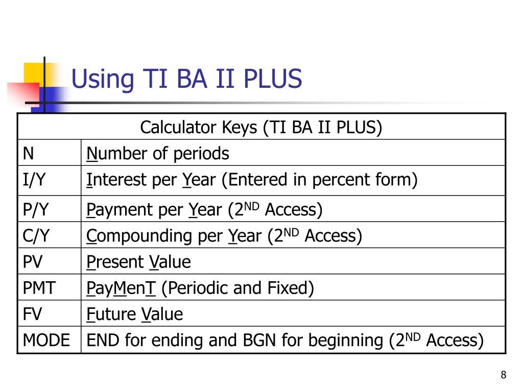Some Important Notes on TI BA II PLUS • We will first use keys located at 3rd row from top of your calculator • To clear previous entries you can use • 2ND CLR TVM • I prefer entering “0” for irrelevant variables • For most cases, PV should be entered as a negative number • Always keep in mind that “N” is number of periods not necessarily years. • Compounding per Year (C/Y) can be modified by changing 2ND P/Y. This determines how frequently interest is earned. • Therefore we will use C/Y and P/Y interchangeably. • There are situations in which you would have to distinguish between the two that we will see in the next chapter • Amount of interest would be based on periodic rate • Periodic Rate = Annual Rate / Number of Periods in a Year • Always make sure P/Y is consistent with the problem at hand – this means you need to check its setting every time. • P/Y also help us determine number of periods • N = P/Y X Number of Years