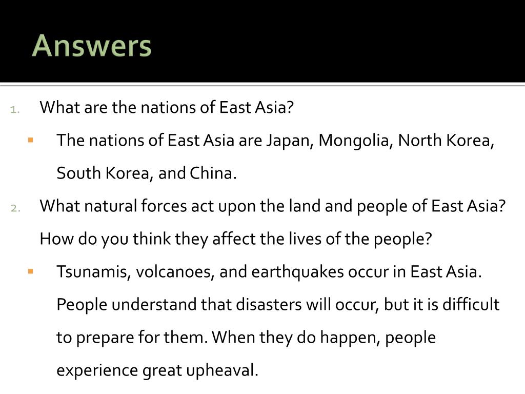 Answers • What are the nations of East Asia? • The nations of East Asia are Japan, Mongolia, North Korea, South Korea, and China. • What natural forces act upon the land and people of East Asia? How do you think they affect the lives of the people? • Tsunamis, volcanoes, and earthquakes occur in East Asia. People understand that disasters will occur, but it is difficult to prepare for them. When they do happen, people experience great upheaval.