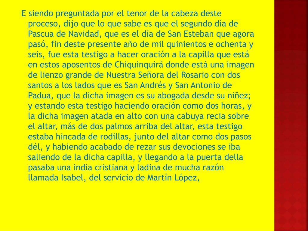 E siendo preguntada por el tenor de la cabeza deste proceso, dijo que lo que sabe es que el segundo día de Pascua de Navidad, que es el día de San Esteban que agora pasó, fin deste presente año de mil quinientos e ochenta y seis, fue esta testigo a hacer oración a la capilla que está en estos aposentos de Chiquinquirá donde está una imagen de lienzo grande de Nuestra Señora del Rosario con dos santos a los lados que es San Andrés y San Antonio de Padua, que la dicha imagen es su abogada desde su niñez; y estando esta testigo haciendo oración como dos horas, y la dicha imagen atada en alto con una cabuya recia sobre el altar, más de dos palmos arriba del altar, esta testigo estaba hincada de rodillas, junto del altar como dos pasos dél, y habiendo acabado de rezar sus devociones se iba saliendo de la dicha capilla, y llegando a la puerta della pasaba una india cristiana y ladina de mucha razón llamada Isabel, del servicio de Martín López,