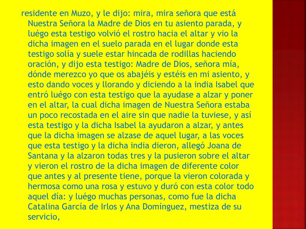 residente en Muzo, y le dijo: mira, mira señora que está Nuestra Señora la Madre de Dios en tu asiento parada, y luégo esta testigo volvió el rostro hacia el altar y vio la dicha imagen en el suelo parada en el lugar donde esta testigo solía y suele estar hincada de rodillas haciendo oración, y dijo esta testigo: Madre de Dios, señora mía, dónde merezco yo que os abajéis y estéis en mi asiento, y esto dando voces y llorando y diciendo a la india Isabel que entró luégo con esta testigo que la ayudase a alzar y poner en el altar, la cual dicha imagen de Nuestra Señora estaba un poco recostada en el aire sin que nadie la tuviese, y así esta testigo y la dicha Isabel la ayudaron a alzar, y antes que la dicha imagen se alzase de aquel lugar, a las voces que esta testigo y la dicha india dieron, allegó Joana de Santana y la alzaron todas tres y la pusieron sobre el altar y vieron el rostro de la dicha imagen de diferente color que antes y al presente tiene, porque la vieron colorada y hermosa como una rosa y estuvo y duró con esta color todo aquel día: y luégo muchas personas, como fue la dicha Catalina García de Irlos y Ana Domínguez, mestiza de su servicio,