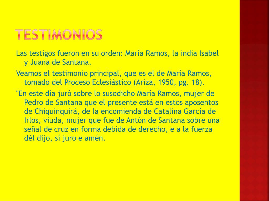 Testimonios Las testigos fueron en su orden: María Ramos, la india Isabel y Juana de Santana. Veamos el testimonio principal, que es el de María Ramos, tomado del Proceso Eclesiástico (Ariza, 1950, pg. 18). "En este día juró sobre lo susodicho María Ramos, mujer de Pedro de Santana que el presente está en estos aposentos de Chiquinquirá, de la encomienda de Catalina García de Irlos, viuda, mujer que fue de Antón de Santana sobre una señal de cruz en forma debida de derecho, e a la fuerza dél dijo, sí juro e amén.