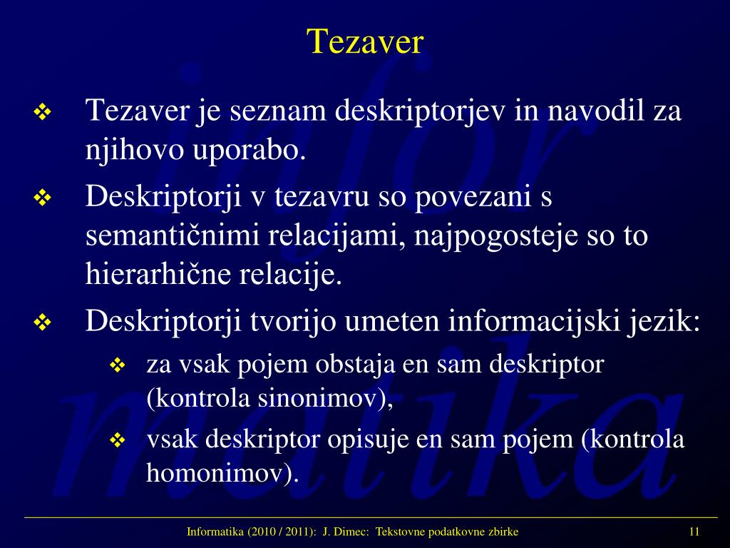 Tezaver • Tezaver je seznam deskriptorjev in navodil za njihovo uporabo. • Deskriptorji v tezavru so povezani s semantičnimi relacijami, najpogosteje so to hierarhične relacije. • Deskriptorji tvorijo umeten informacijski jezik: • za vsak pojem obstaja en sam deskriptor (kontrola sinonimov), • vsak deskriptor opisuje en sam pojem (kontrola homonimov). Informatika (2010 / 2011): J. Dimec: Tekstovne podatkovne zbirke