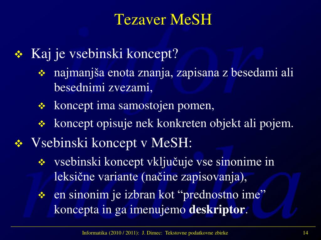 Tezaver MeSH • Kaj je vsebinski koncept? • najmanjša enota znanja, zapisana z besedami ali besednimi zvezami, • koncept ima samostojen pomen, • koncept opisuje nek konkreten objekt ali pojem. • Vsebinski koncept v MeSH: • vsebinski koncept vključuje vse sinonime in leksične variante (načine zapisovanja), • en sinonim je izbran kot “prednostno ime” koncepta in ga imenujemo deskriptor. Informatika (2010 / 2011): J. Dimec: Tekstovne podatkovne zbirke