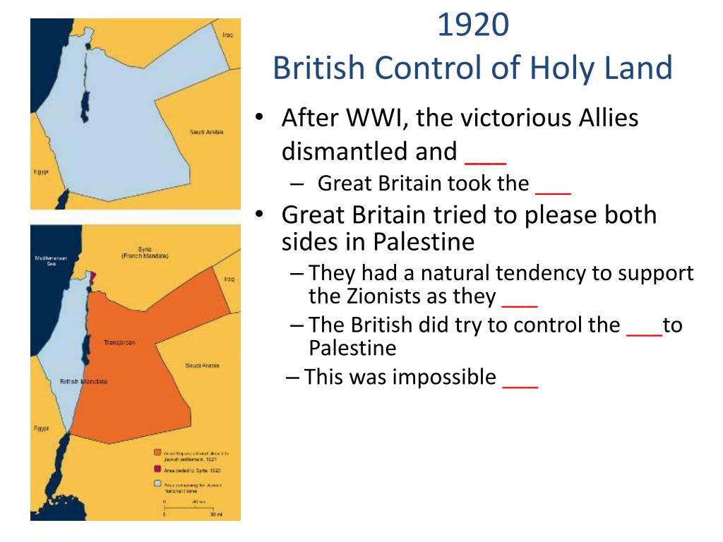 1920 British Control of Holy Land • After WWI, the victorious Allies dismantled and ___ • Great Britain took the ___ • Great Britain tried to please both sides in Palestine • They had a natural tendency to support the Zionists as they ___ • The British did try to control the ___to Palestine • This was impossible ___