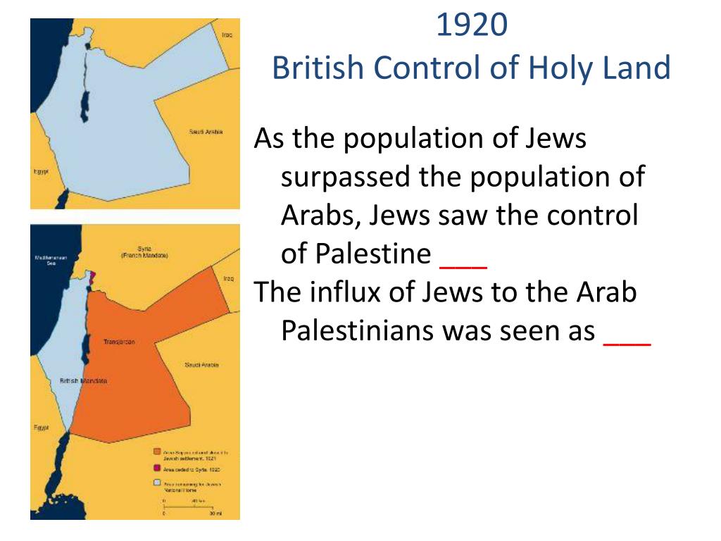 1920 British Control of Holy Land As the population of Jews surpassed the population of Arabs, Jews saw the control of Palestine ___ The influx of Jews to the Arab Palestinians was seen as ___