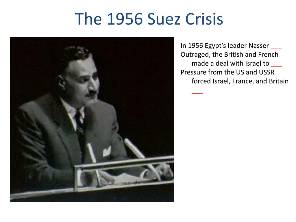 The 1956 Suez Crisis In 1956 Egypt’s leader Nasser ___ Outraged, the British and French made a deal with Israel to ___ Pressure from the US and USSR forced Israel, France, and Britain ___